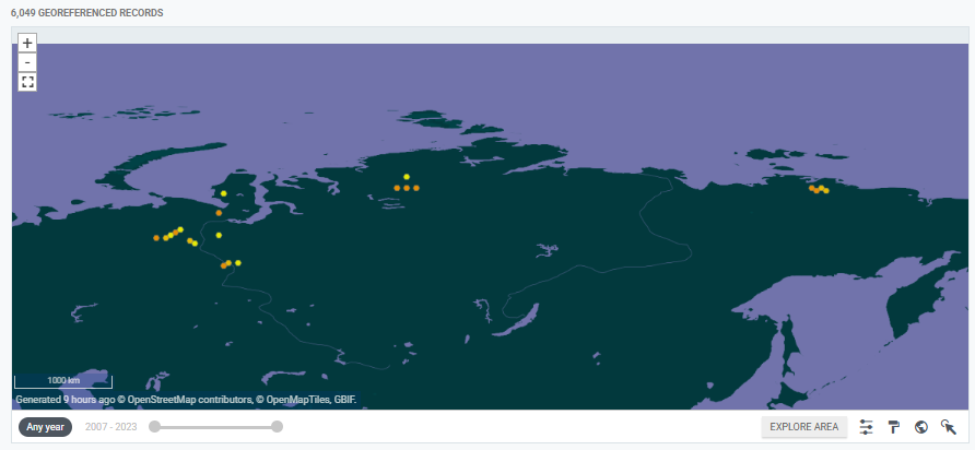 The majority of digitized specimens made in the adminstrative borders of Khanty-Mansi Autonomous Okrug (64%), Krasnoyarsk Territory (15%), Respublika Sakha (13%), and from Yamalo-Netets Autonomous Okrug (7%).