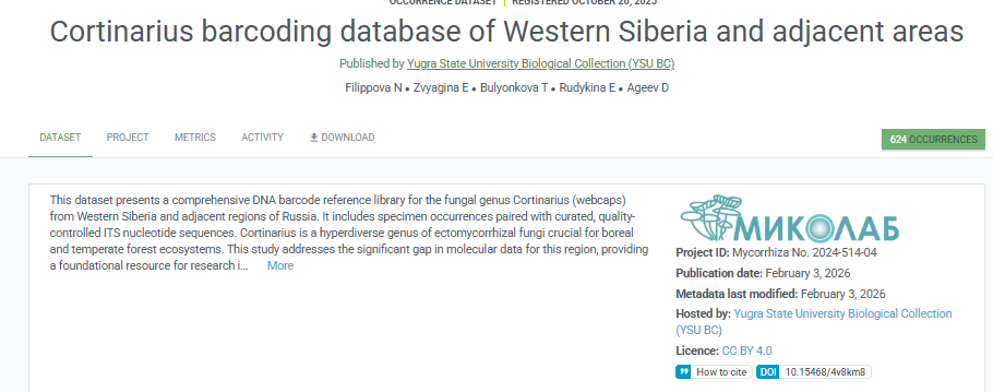 Filippova NV, Bulyonkova TM, Zvyagina EA, Ageev AD, Rudykina EA, 2026. Cortinarius barcoding database of Western Siberia and adjacent areas // Biodiversity data Journal (статья на рецензировании)